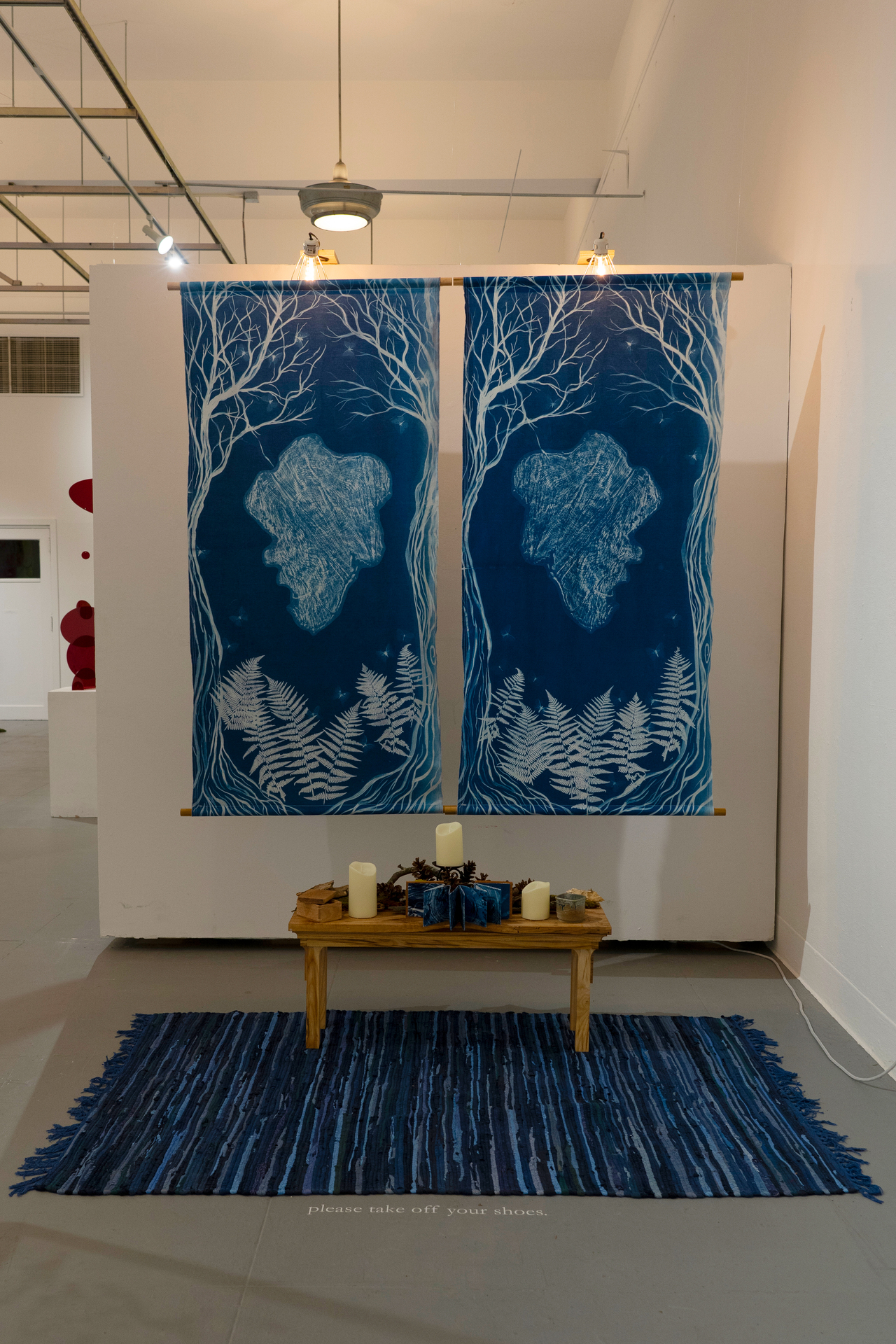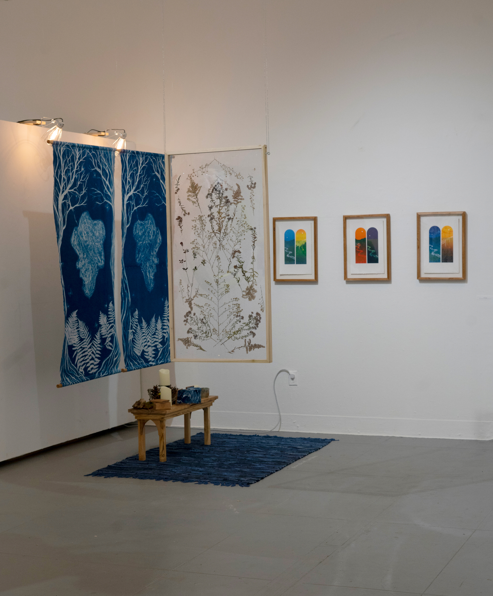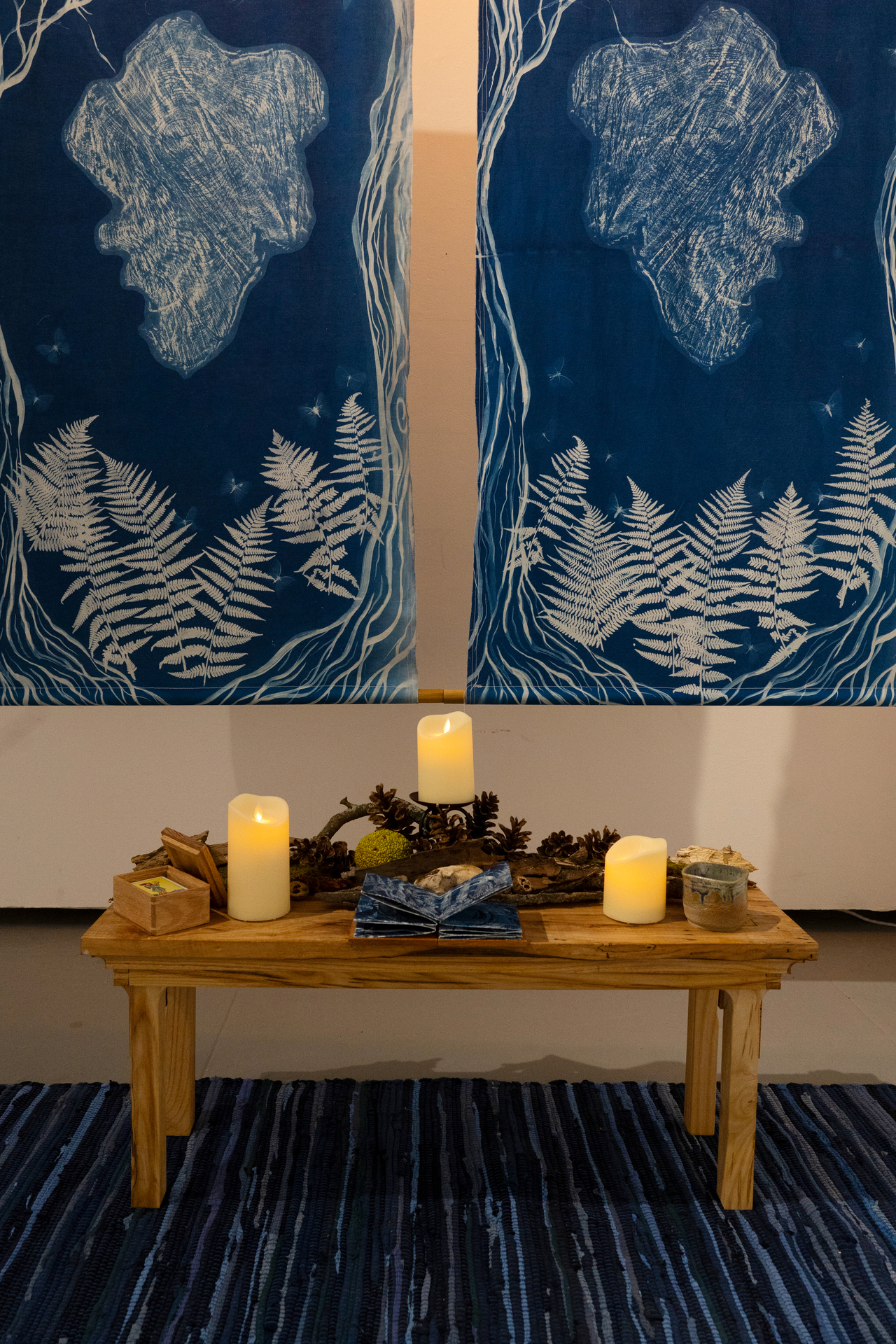 In this exhibition I was playing with the idea of bringing sacred space into the gallery context. My personal spiritual practice in recent years has revolved around the natural world and my place in it. Creating time and physical spaces for ritual in my life, especially that connect me to my surroundings, has helped me ground myself.