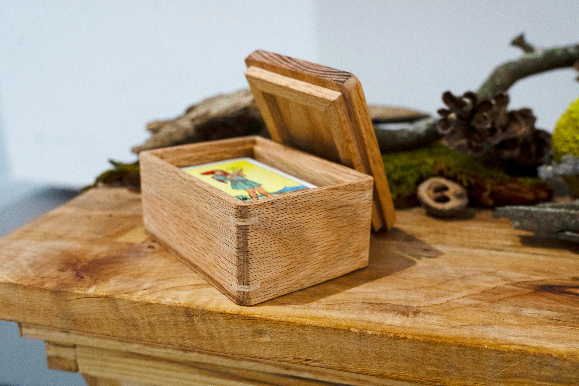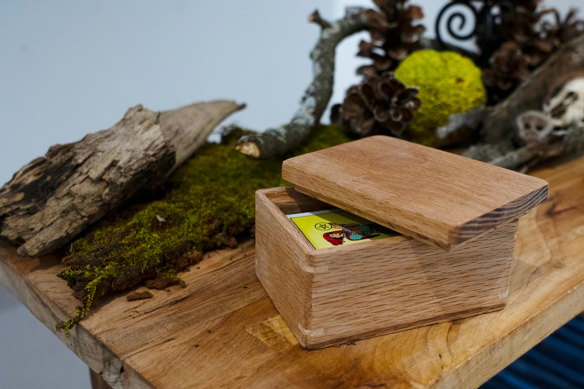 Altar Table: maple and ash wood, paired with red oak tarot box, found natural materials, and elements from my own altar.